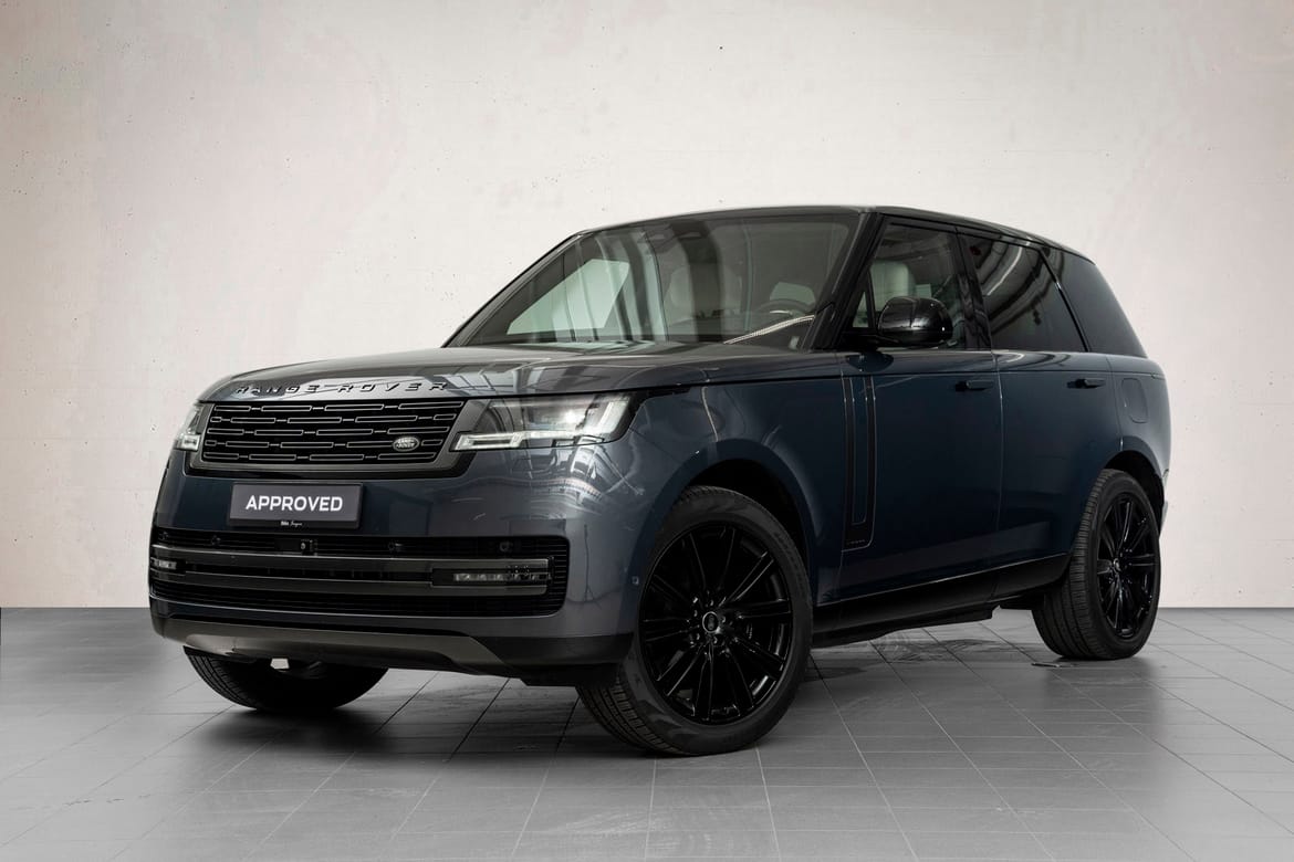 Range Rover P550e Autobiography fra 2024 i Varesine Blue med plug-in hybrid drivlinje, firehjulstrekk og 550 hk. Dette er en utgave med høy spesifikasjon, der raffinert komfort er kombinert med presis kjøredynamikk, avansert førerassistanse og solid elektrisk rekkevidde. Autobiography-nivået gir en gjennomført premiumopplevelse med eksklusive materialvalg, Executive Class-bakseter og et omfattende komfortutstyr. Bilen er levert ny til Norge og fremstår med 22” Style 1073 Gloss Black-felger, Shadow Exterior Pack og elektrisk nedfellbart hengerfeste.